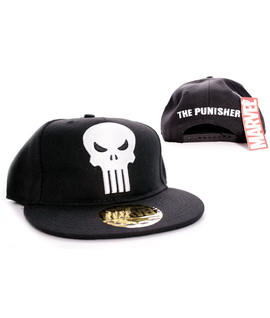 Punisher Logo cappellino ufficiale Marvel. Cotone, chiusura snapback, adesivo prismatico sulla visiera, colore nero. Taglia unica
